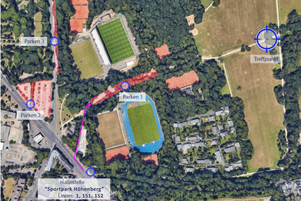 Was das Parken angeht empfehlen wir den Günter-Kuxdorf-Weg (Parken 1), dort gibt es einige Parkplätze und diese sind die nächsten an unseren Trainingsorten. Manchmal sind diese aber überbesetzt aufgrund von Fußballspielen in den anliegenden Arenen. Dann bietet sich der nahe Höhenberger Ring (Parken 2 & 3) an. Hier sind eine gute Anzahl weiterer Parkmöglichkeiten.